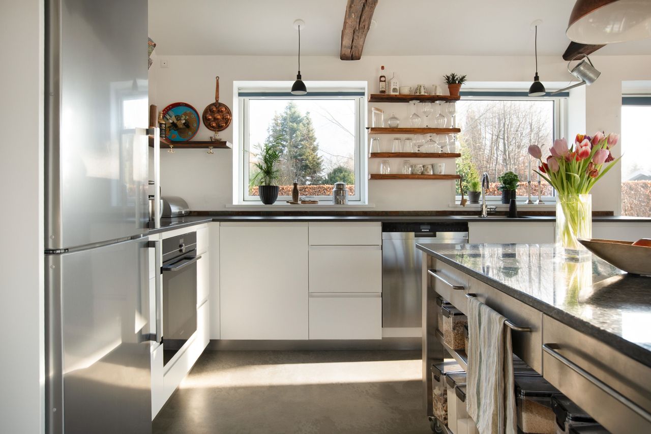 Hyldevej 1 er et hjem, hvor intet er overladt til tilfældighederne. Boligen er på 120 m² og opført i ét plan med samme niveau hele vejen igennem, hvilket skaber en naturlig sammenhæng mellem hus, terrasse og have. Indretningen er enkel og funktionel med to soveværelser, en hems med ekstra soveplads og et stilrent Kvik-køkken som boligens samlingspunkt. Betongulvene giver et roligt, arkitektonisk udtryk og er samtidig både rengørings- og vedligeholdelsesfri, mens de synlige hanebånd og bjælker i op til 100 år gammelt træ tilfører varme og karakter.