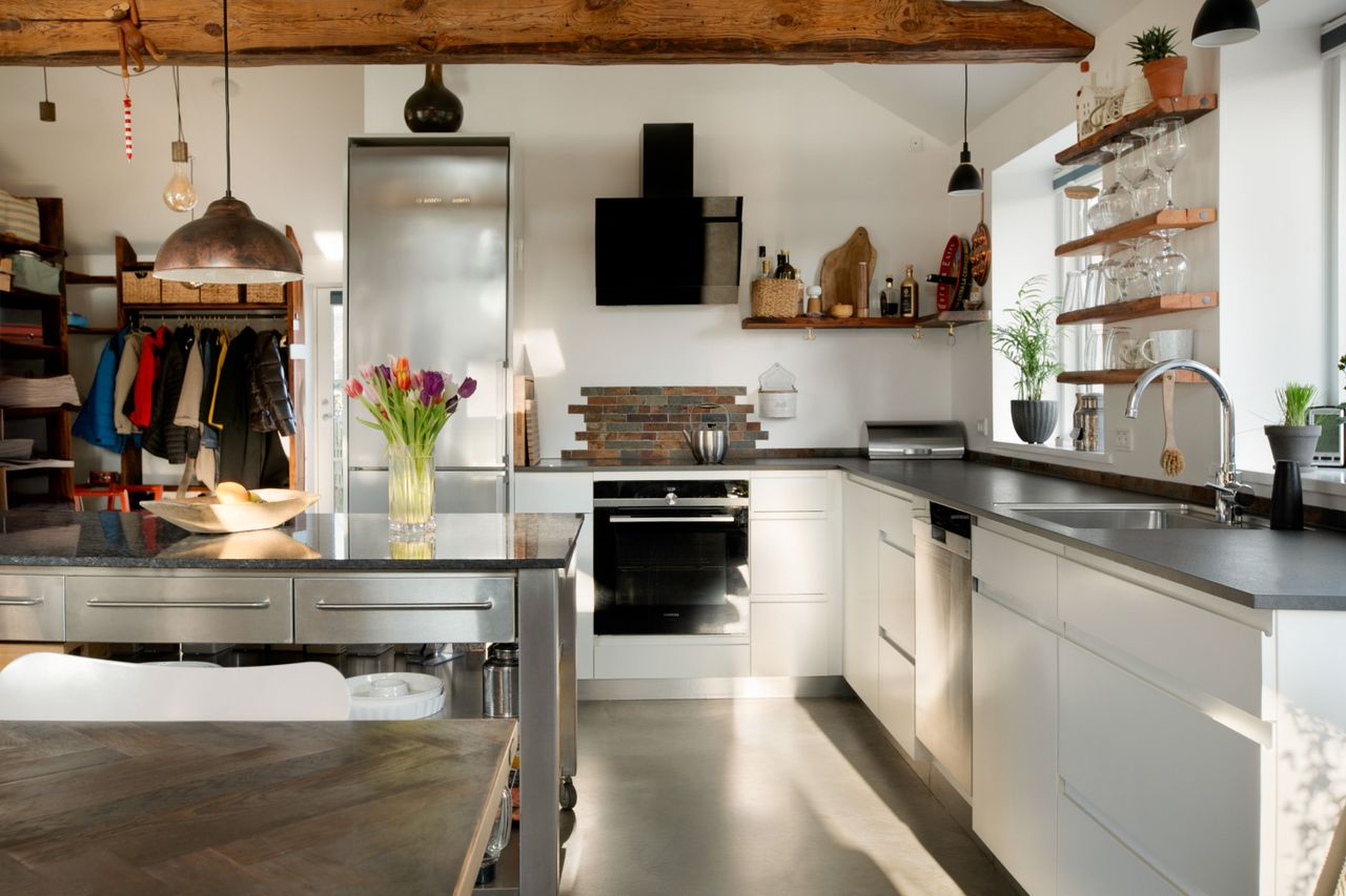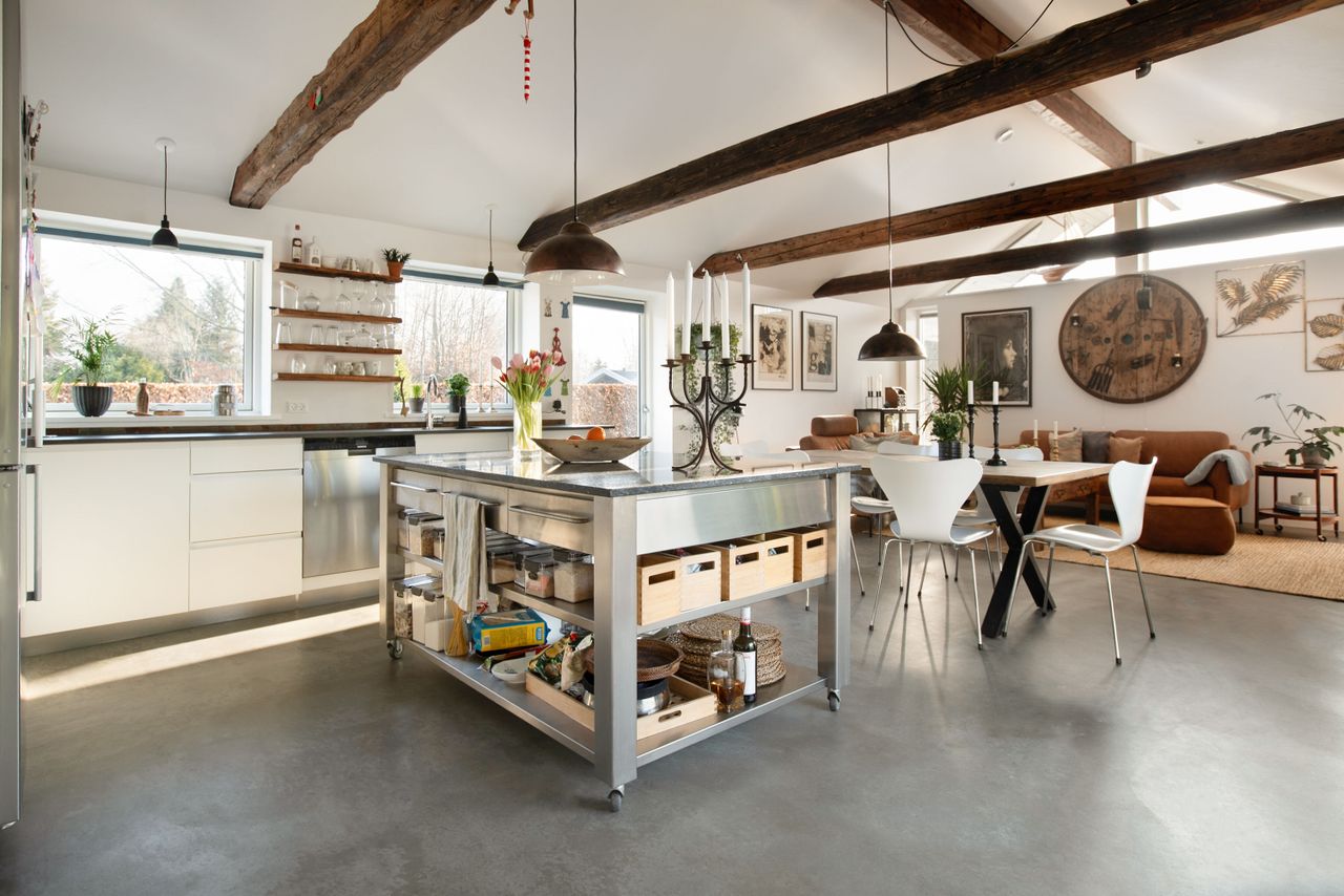 Hyldevej 1 er et hjem, hvor intet er overladt til tilfældighederne. Boligen er på 120 m² og opført i ét plan med samme niveau hele vejen igennem, hvilket skaber en naturlig sammenhæng mellem hus, terrasse og have. Indretningen er enkel og funktionel med to soveværelser, en hems med ekstra soveplads og et stilrent Kvik-køkken som boligens samlingspunkt. Betongulvene giver et roligt, arkitektonisk udtryk og er samtidig både rengørings- og vedligeholdelsesfri, mens de synlige hanebånd og bjælker i op til 100 år gammelt træ tilfører varme og karakter.